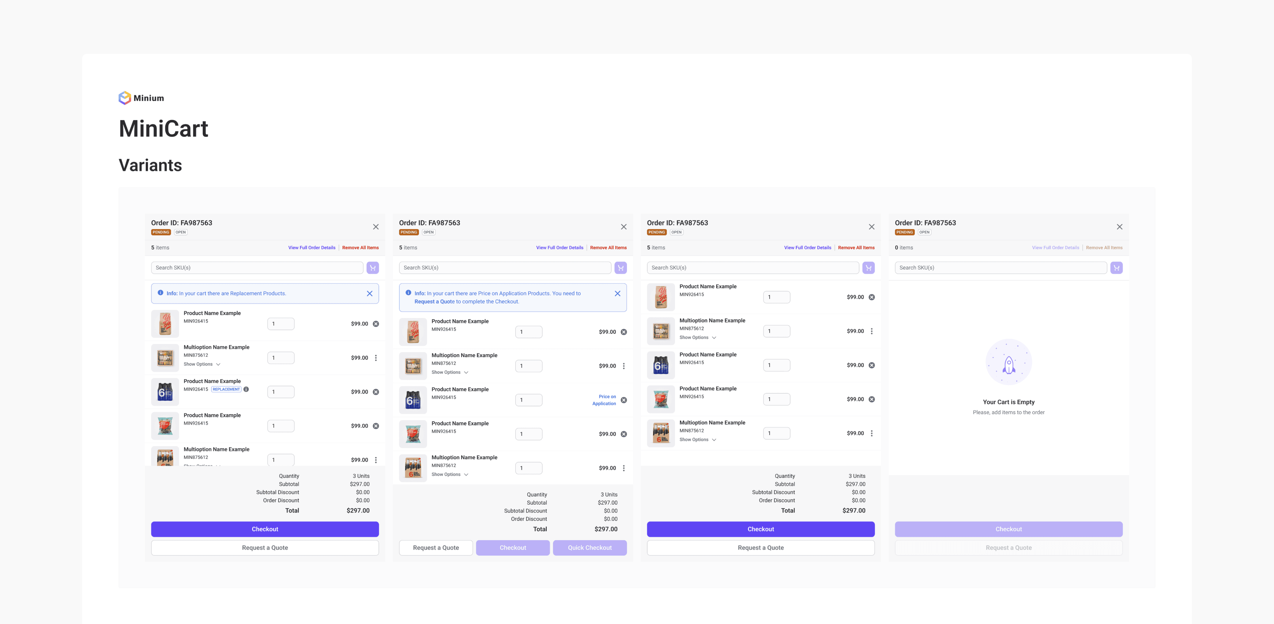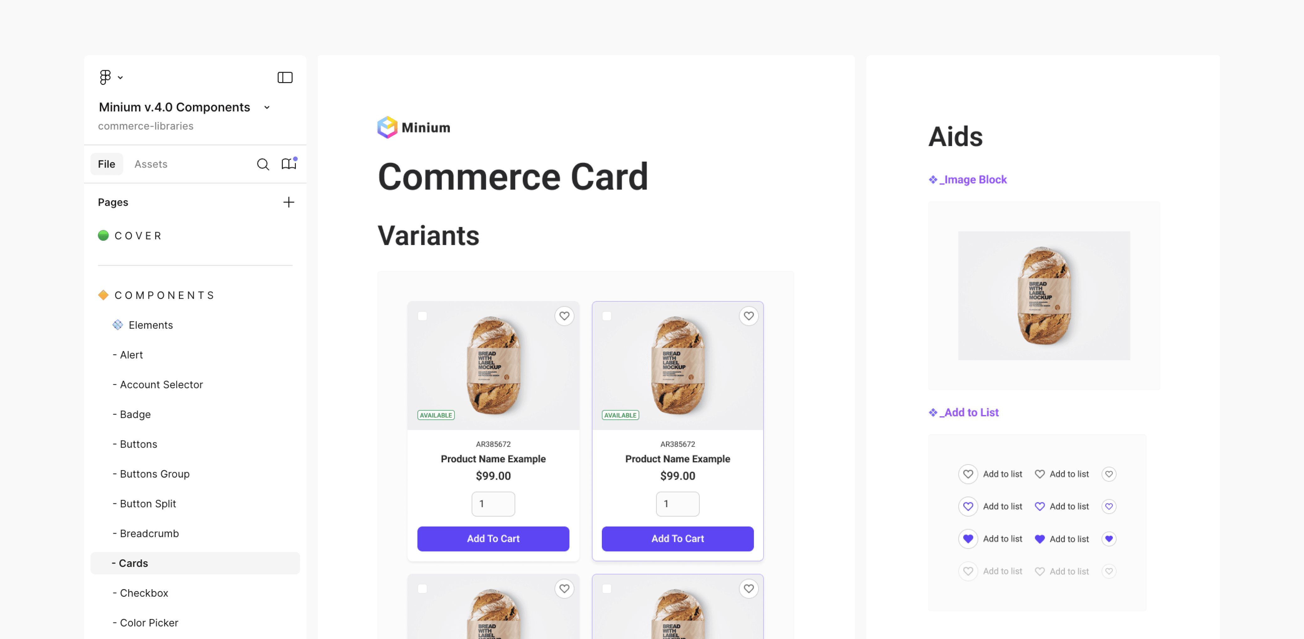 In the Components file, I organized all UI components in a clear and structured way. The file presents a progression from simple components to those with related aids and multiple variants, and finally to more complex components such as tables and the minicart. Each component is displayed in a clean layout within the main content area, allowing for easy visualization and understanding of its structure and variations.